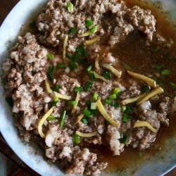 3. Spread the minced meat evenly on top of the bean paste.Steam in a rice cooker.