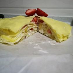18. Spread a layer of cake, spread a layer of cream and sprinkle a layer of fruit pieces