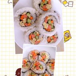 For both kinds of sushi, the one with rice on top is to put a piece of plastic wrap on the rolling shutter first, then put the rice, then put the nori and put the ingredients in order and roll it up.It’s ok~ I’m here to join in the fun and post a cooking recipe, simple, easy to learn and delicious sushi