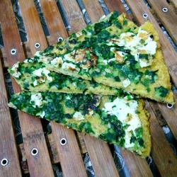 6.Then sprinkle the leeks and eggs evenly on the cornmeal, cover and fry for five minutes (if you like shrimp skin, you can add some shrimp skin)