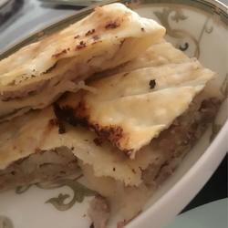 5. Then roll the dough into a round shape (thin), place the stuffing as shown in the picture, and then preheat the pot
