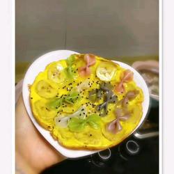 5. Spread the banana slices and the water-controlled small butterflies evenly on the On top of the egg cake, add the remaining egg liquid and fry slowly until cooked.