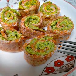 7.Put two different vegetable cakes together and roll them up into small pieces p>