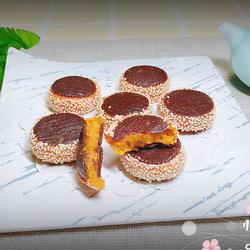 14. Cover the pumpkin glutinous rice filling with a piece of biscuit on both sides.