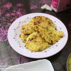 4. Pour a little oil into the pot, use a spoon to make the mixed rice into a cake shape.Add to pan and fry.