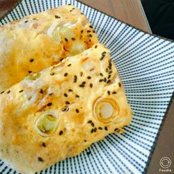 2. Heat the pan with some oil, preferably non-stick, and pour it in Just the right amount of batter.Quickly spread the batter evenly over the entire bottom of the pan.When one side is cooked, turn over.Then crack in the eggs and spread evenly, sprinkle with chopped green onions and black sesame seeds and continue to fry until cooked.