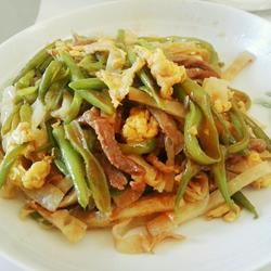 1. Cut the beans, flatbread and tenderloin into shreds respectively, beat the eggs