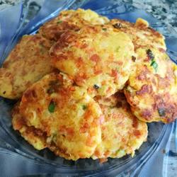 5.Put a little oil in the frying pan, then add the potato cakes and press lightly Fry until golden brown on both sides