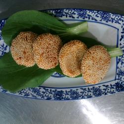 3. Shape into balls, press into a nest and add bean paste, then dip in sesame seeds.
