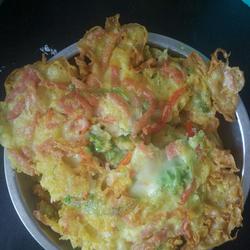 3.Put the cut vegetables into the batter, stir evenly so that the vegetables are immersed in the batter