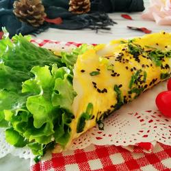 7.When the eggs are almost solid, sprinkle with chopped green onion and black sesame seeds