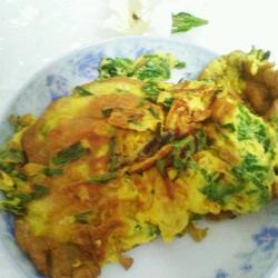 4.Put oil into the pot.When the oil is hot, pour the eggs and leeks together..On one side, fry until brown.Flip over and cook until golden brown.