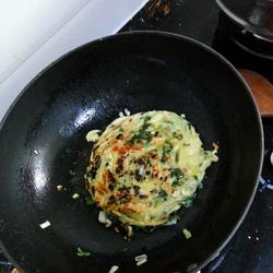1.Dry the cooked noodles into a large pancake, chop the green onions and add the ingredients