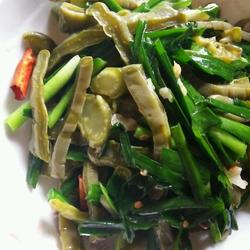 6. After the dried chili and garlic smell comes out, add the pancake and fry for a while, then add the leeks.After sautéing the leeks until soft, add salt and MSG and add them to the pan.