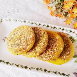 8. Place the prepared pumpkin cake base on the sesame plate , so that both sides are covered with sesame seeds.Take it out and press it to make the sesame seeds firmer and prevent them from falling off when frying in the pan.