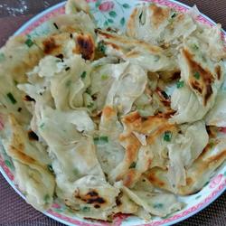 2.Press thinly, apply oil, green onions, and sprinkle with salt
