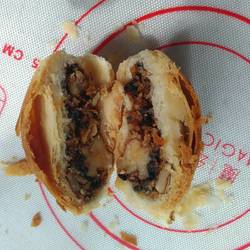 5. Mix the puff pastry ingredients into the dough, and then mix the oil crust ingredients into the dough., divide evenly into 20 small portions each, roll out the puff pastry into pieces, wrap tightly in oil dough, roll into a round shape and add appropriate amount of filling.Do it in sequence.As shown in the picture.