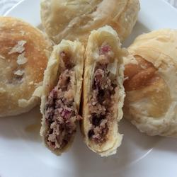 15. Spread a thin layer of corn oil on the baking sheet and preheat the oven at the same time , 180 degrees, 10 minutes.Then press the stuffed dough into small rounds and place them on the baking sheet.
