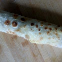 4. Place the pancake on the chopping board, foam a layer of sauce, add pickles, green peppers, onions, diced ham, lettuce and roll into pancakes