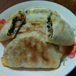 9.Take out a small piece of dough, roll it out, and put the filling into the dough, like dumplings shape! ! Put oil in electric baking pan.Heat the oil and put in the cake, press the button to press the pie button, as shown in the picture! !