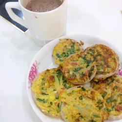 3. Heat the oil, turn it around, add the onion rings, and use a spoon to put the prepared egg liquid together Put it into the onion rings and fry over low heat without burning