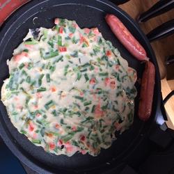 1. Chop the leeks and sausage into small pieces Set aside, mix into flour, mix into a paste, add appropriate amount of salt, then heat the pancake stall and add oil, pour the batter in and spread it out