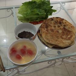 9.Pour a little peanut oil into the pot, heat it up, then turn down the heat, put in the rolled out pancake, wait until the bottom is golden brown, then bake this side