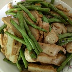 4. When the ginger and garlic are fragrant, stir-fry the beans, then add salt and chicken powder and stir-fry until the beans change color