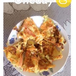 5. Pour an appropriate amount of salad oil into the pan, pour the mixed ingredients into the pan, and use a shovel Flatten it, fry one side and then switch to the other side