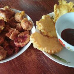 8. Place the fried fish meatballs on a plate, and don’t waste the remaining batter.You can fry the pancakes, fry them until they are golden on both sides, and put them on the plate.You forgot to take a photo of the fried batter, and put tomato sauce in the bowl.It’s time to eat! !