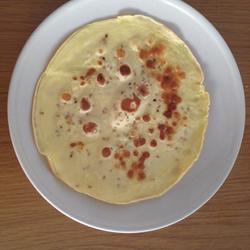 4.Now it is ready to fry.In a frying pan, when the oil is hot, turn down the heat and pour in the batter.Don't pour too much, just turn it around just enough to cover the bottom of the pan.
