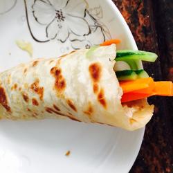 14. Add appropriate amount of red radish, cucumber and shredded pork, roll it up and serve.