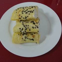 The pancakes should be cooked on low heat and move the bottom of the pan frequently to avoid burning.The sesame seeds should be sprinkled on the egg liquid before it is cooked, so that it will be wrapped in the egg liquid and will not fall off easily.