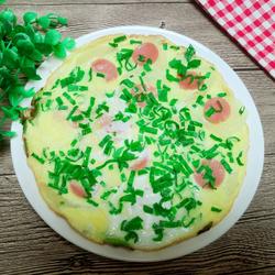 13. Pour in 7 egg liquid and pour evenly! Sprinkle garlic leaves, cover the pot and fry over medium-low heat.