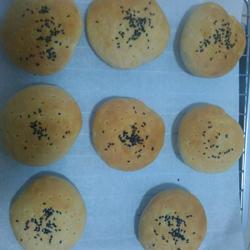 14. Preheat the oven to 170 degrees for 5 minutes.Place the cake on the baking sheet, brush both sides with a thin layer of oil, sprinkle with sesame seeds and flatten with the palm of your hand as shown below.