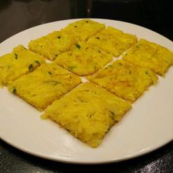 5.Grab a handful of potato shreds, about half a potato, shake off the water and drain Put it into a large bowl and put the eggs, chopped green onion, minced garlic, white pepper and salt into the large bowl.
