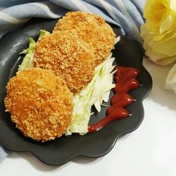 6.Make the mashed potatoes into a round shape, flatten them, not too thick, first dip them in flour and then Dip in egg wash and finally bread crumbs.