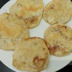 7. Gently press the dough filled with meat filling into a pancake.Brush the surface with salad oil.