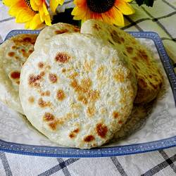 9.Preheat the pan in advance and press it easily with your hands Open the front and back of the cake embryo and press it open so that the thickness of the cake on both sides is the same.Place it in the pan and bake over low heat