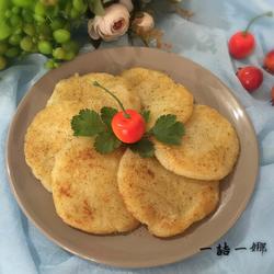6.Take an appropriate amount of mashed potatoes and press into a cake shape, put it into a pot and fry over medium-low heat.