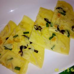 6. When the batter is still liquid, sprinkle mung bean sprouts, leeks, and black fungus evenly.