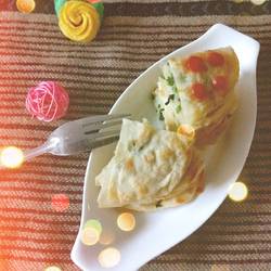 4.The fourth step is to brush oil, sprinkle salt and chopped green onion, then cover the dough, then brush oil again and sprinkle Sprinkle the chopped green onion with salt and cover the dough with four layers of dough,