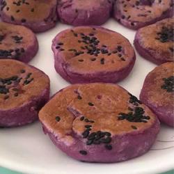 4. Put the purple potato paste in the middle of the purple sweet potato dough, wrap it up and press it flat, with both sides Touch some black sesame seeds.