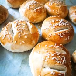 17.Use a knife to make 2 slits on the dough, brush with egg wash and sprinkle with white sesame seeds embellishment.