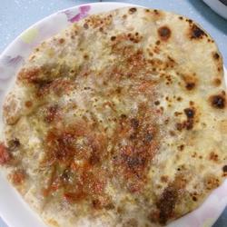 6. Wrap all the ingredients at once and sprinkle some flour on the panel to prevent sticking.Take out a bun and flatten it with your hands first.Be sure to control the strength., and then use a rolling pin to roll it out evenly and thin