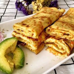14. Fry each side twice, fold the pancake in half, roll it up, and then cut it in half with a spatula