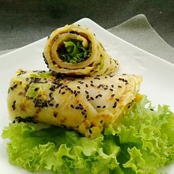 9. Cut the pieces Sprinkle chopped green onion on top, sprinkle with black sesame seeds, and do the same on the other side,