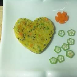 7.Add chopped carrots, chopped colored peppers, chopped okra, chopped green onions, and add three grams Salt, black sesame seeds, mix well.