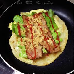 4.Turn off the heat, add lettuce leaves, bacon, meat floss, pour tomato sauce, and salad Sauce.You're done