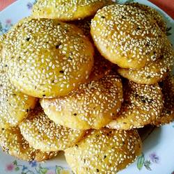 12.Put it into the prepared sesame seeds and stick them on both sides.(After sticking the sesame seeds, press it slightly with your hands to make the sesame seeds fit well with the pumpkin cake, so that the sesame seeds will not spill out too much when they are fried.)